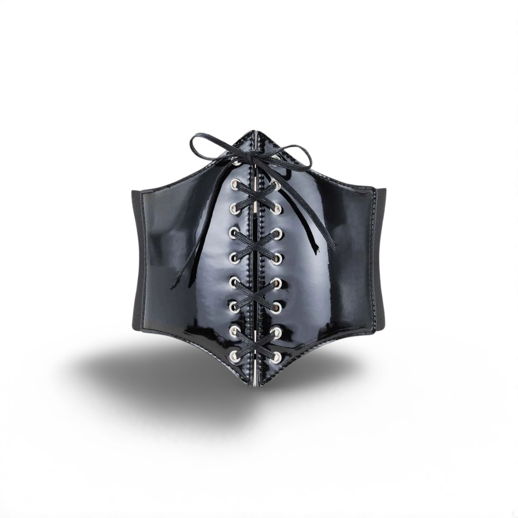 Este corsé cinturilla de charol con ojales combina un diseño elegante y audaz que realza tu figura con un toque moderno. Perfecto para quienes buscan destacar con estilo y confianza.